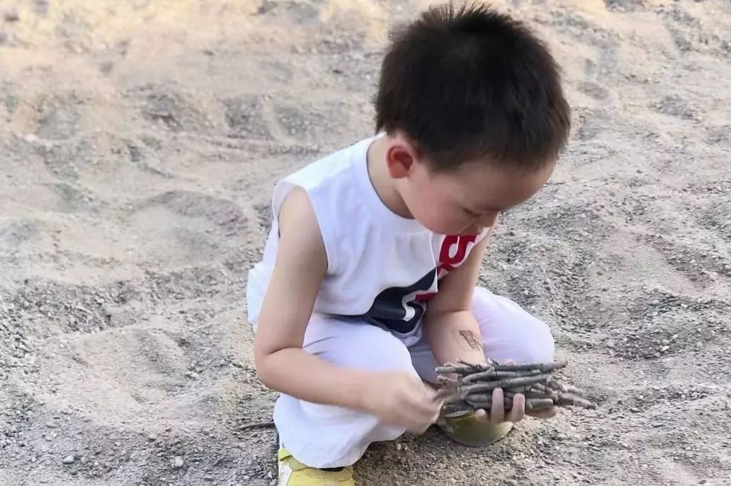 哪里有沙子,他就在哪里两眼放光,心心念念全是拿铲子和小桶堆沙子玩,玩得浑身都是沙砾,临走时还哭成不成人形。